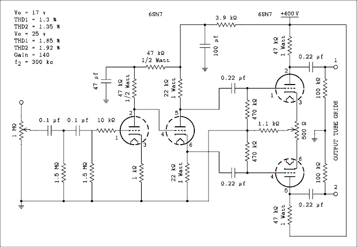 The above circuit is 50 years old if it's a day. I decided to try to reduce the distortion by using somewhat more modern tubes. The 6SN7 goes back to the world war II years.I used a 12AX7 for the first amplifier. This tube performs best with a relatively high plate voltage while the direct coupling to the phase splitter wants the plate voltage to be somewhat low, ideally 1/4 of the B+ voltage.