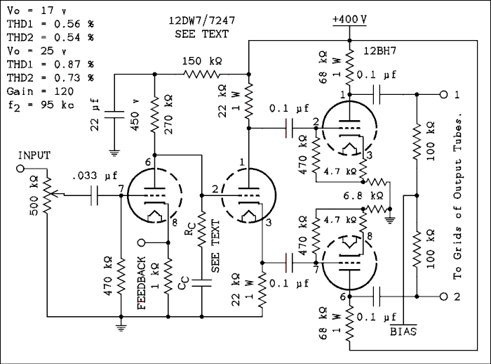 This version also contains two low frequency roll-offs. The two 0.22 uf caps looking into 100 k ohm resistors make up one and the other is the 1 Meg and 0.22 in the grid of the lower tube. As this network rolls off the same signal will begin to be applied to both grids. Although there will still be a considerable amount of in-phase signals applied to the two grids of the outputs, they will be cancelled in the output transformer. This causes a low frequency roll-off and the accompanying phase shift inside the feedback loop. It is possible to design a long tail pair that will do better than this.