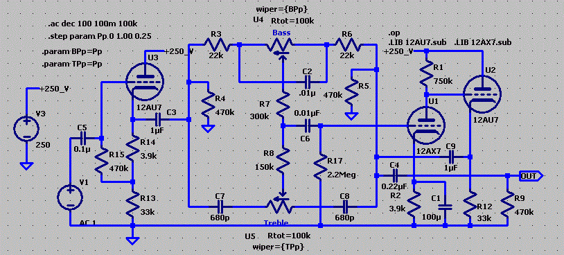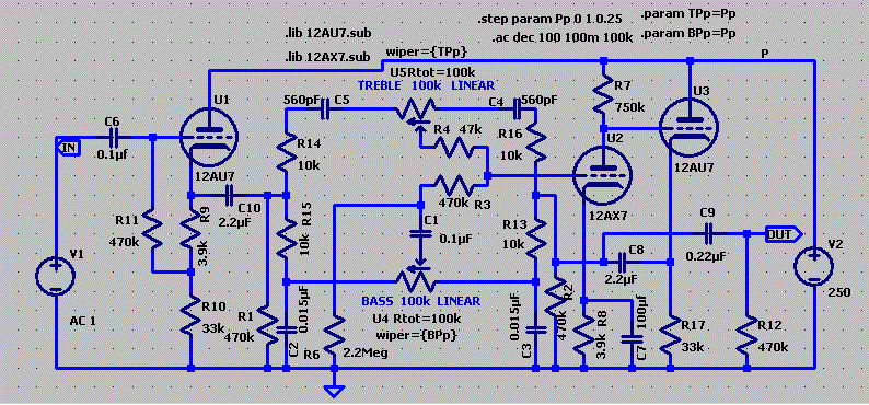 Below is the schematic of the simulation. R4 and R5 simulate the Treble pot. The Bass pot has its upper half shorted out as you can see in the schematic above. R6 was representing the upper half of that control so I deleted it leaving a gap in resistor numbers. R7 represents the bass rheostat. The midrange control is also connected as a rheostat and is represented by R8. The volume control pot is represented by R9 and C5.