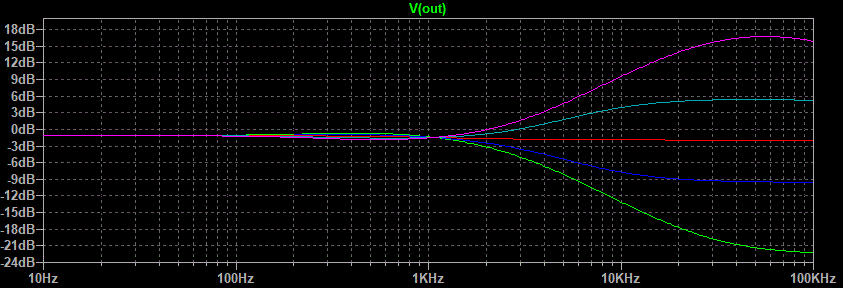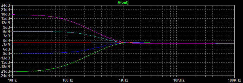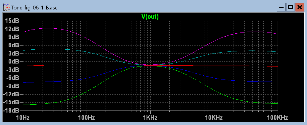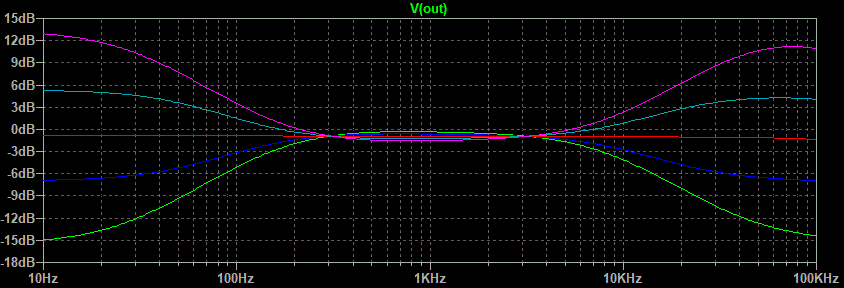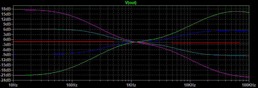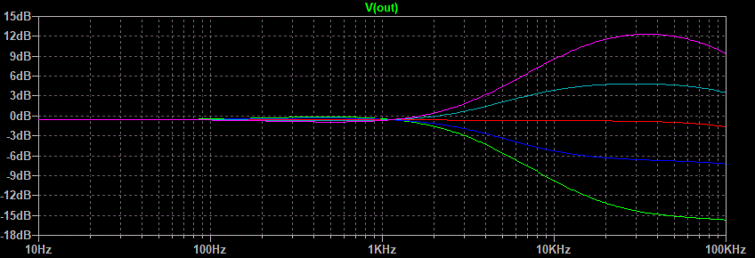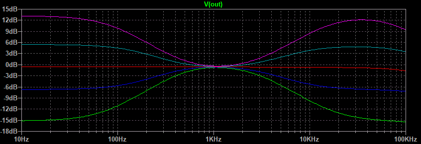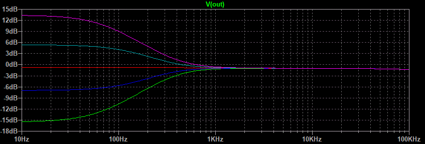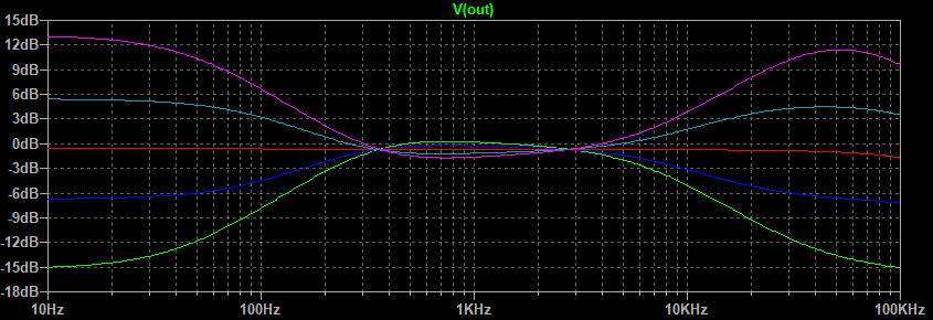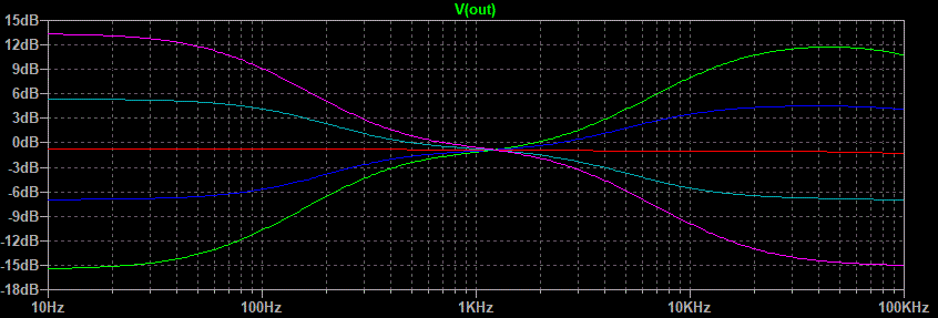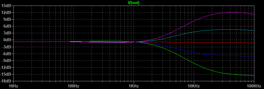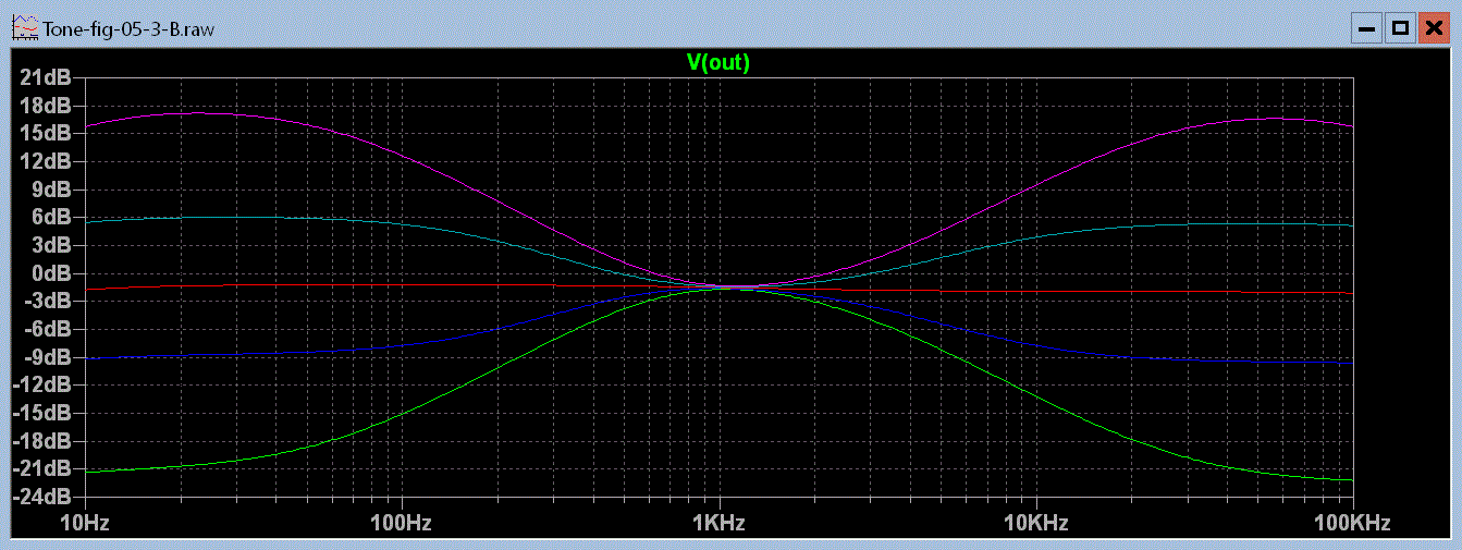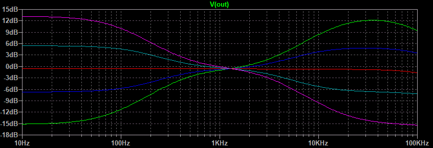 Well that looks pretty good. The green line is both pots fully counterclockwise, the blue line is half way between that point and center of rotation, the red line is center, the light blue line is half way between center and fully clockwise, and the purple line is fully clockwise. The center between boost and cut seems to be a little low in frequency but after all this is just a demonstration of what is possible.This circuit still has one flaw. Notice on the treble side that the half boost merges with the maximum boost between 1 and 5 kHz. Same goes for the maximum cut and half cut. Because the ear is more sensitive in this range than it is higher up the treble control would appear to have all of its effect in half of its rotation. This is caused by the use of one capacitor connected to the wiper of the treble pot. The circuit variation that uses two capacitors on either side of the treble pot gives a much better treble response graph.