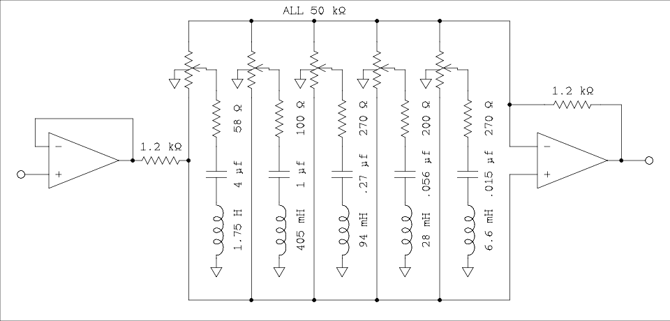Look at the top four bands in figure 14 and compare to figure 4. Except for component values they are identical. These bands use inductors that appear similar to transistor radio IF transformers complete with adjustment slug. The bottom 6 bands use gyrators to replace real inductors. A real inductor for the 31 Hz band would have to be 5.6 Henrys. Apparently the performance of gyrators at frequencies of 1 kHz and lower is close enough to that of real inductors to make using them feasible. No doubt a high performance equalizer could be made with real inductors for all bands but its price would place it firmly in the professional audio market.