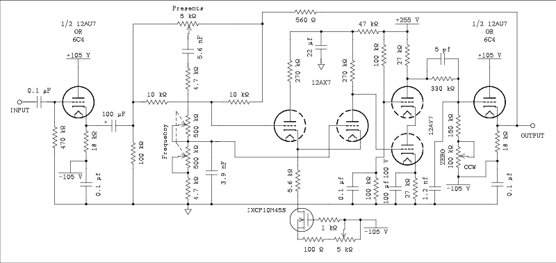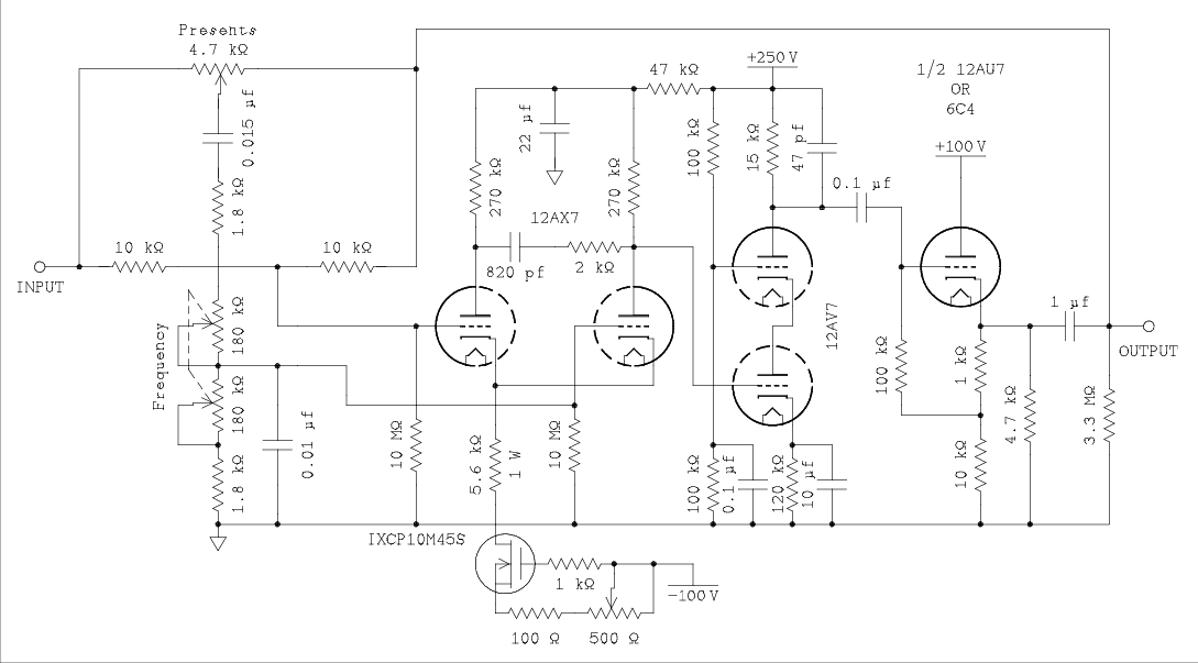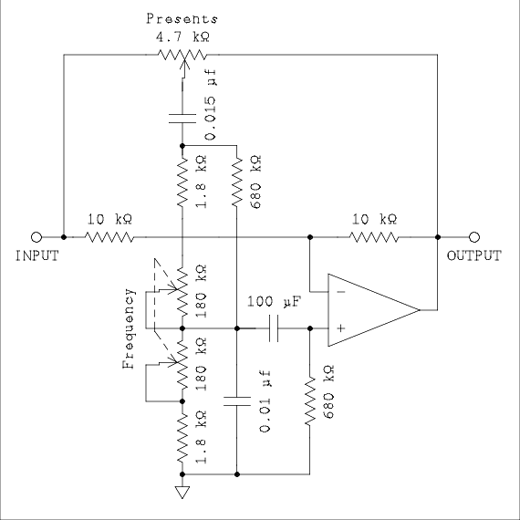 This is the simplest circuit around. There are others that use more op amps and have three controls, Frequency, Bandwidth, and presents. Since we are going to build it with tubes I think that one amplifier is all we can afford.