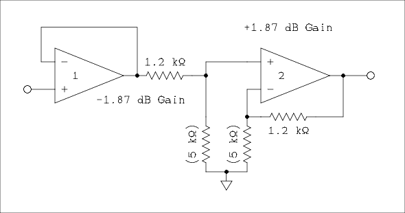 So what we see is a resistive attenuator which is virtually unloaded by the near infinite input impedance of a noninverting amplifier. Then the noninverting amplifier has the same amount of gain as was lost in the attenuator giving an overall gain of unity or 0 dB. The attenuation of the resistive attenuator is given by