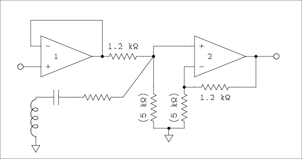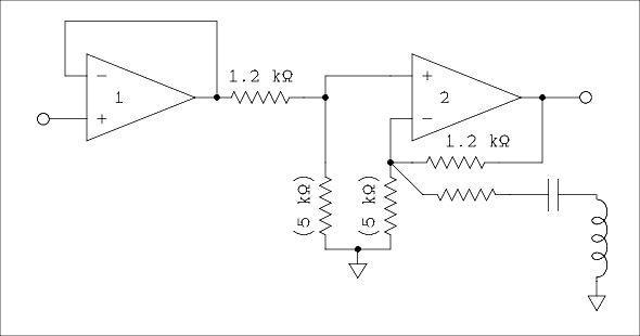 Let's start by looking at the circuit when all of the pots are set to center which causes the wipers to be at ground potential. The tuned circuits will have no effect because both ends of each circuit are grounded. The input signal passes through a unity gain amplifier whose purpose is to provide a low and constant output impedance to the equalizer circuit. All of the pots are nothing more than resistors in parallel from the noninverting input of the op amp on the right to ground. These are 50 k ohm pots and the grounded tap is in the exact center. That means 25 k ohms of resistance from each end of each pot to ground. When five 25 k ohm resistors are connected in parallel the combined resistance is 5 k ohms. These are the values in parentheses in figure 4. The right hand amplifier which we will refer to as amplifier 2 is a noninverting amplifier with gain greater than unity. An equivalent circuit is shown in figure 4 below.