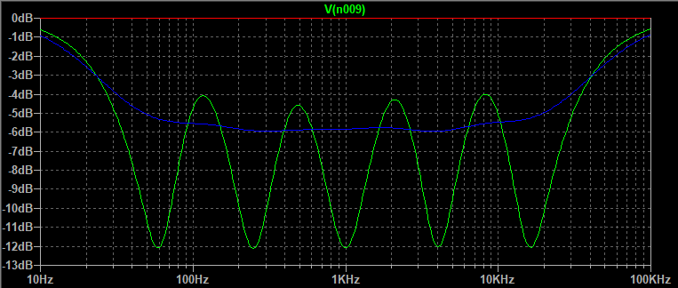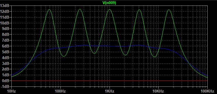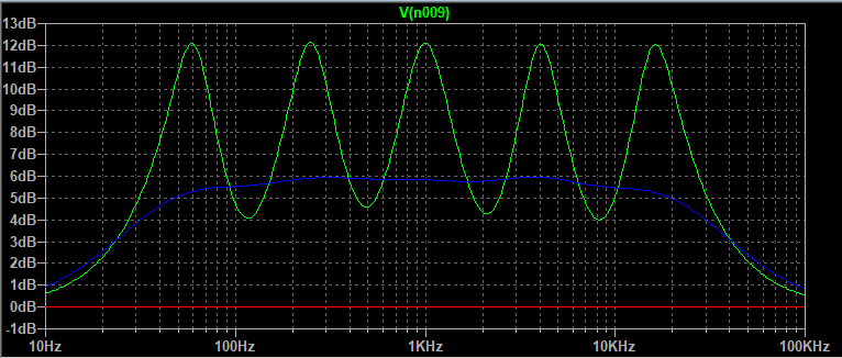 Simulating a pot in Spice requires two resistors that are stepped in value using commands in Spice that are made for that. A pot with a center tap is double trouble. It takes 4 resistors and only half of the pots' rotation can be simulated at one time. (Note: I have since learned how to insert a pot and use it in a step command. I think a tapped pot is also possible, it just takes a little more setting up. The learning curve for spice is never ending.) A connection must be changed in the schematic to do the other half. My simulation looked like this for the boost half of the control. The three graph lines are green full boost (+12 dB) or cut (-12 dB) on all bands, blue (+6 dB or -6 dB) boost or cut, and red zero no boost or cut (center).