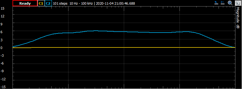 I tested the amplifier set to gains of 20 dB, 10 dB, 0 dB, -10 dB, and -20 dB. Only the gain of 0 dB, unity gain, is shown here.