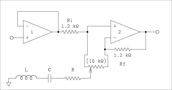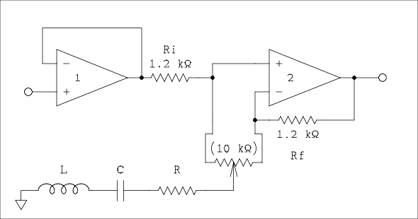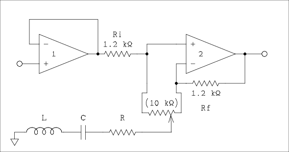 If we move one of the pots downward off of center ground the tuned circuit associated with that pot is connected from the noninverting input of OA2 to ground as shown in figure 5. The series resistor is that part of the slide pot from the wiper to the bottom end. As the pot is moved downward the resistor grows smaller which increases its effect on the signal. Also as an unwanted side effect the Q of the tuned circuit grows higher. A series resonant circuit has its lowest impedance at resonance which means that at this frequency the effective resistance of R2 is decreased causing the input voltage to be reduced at and near resonance.
