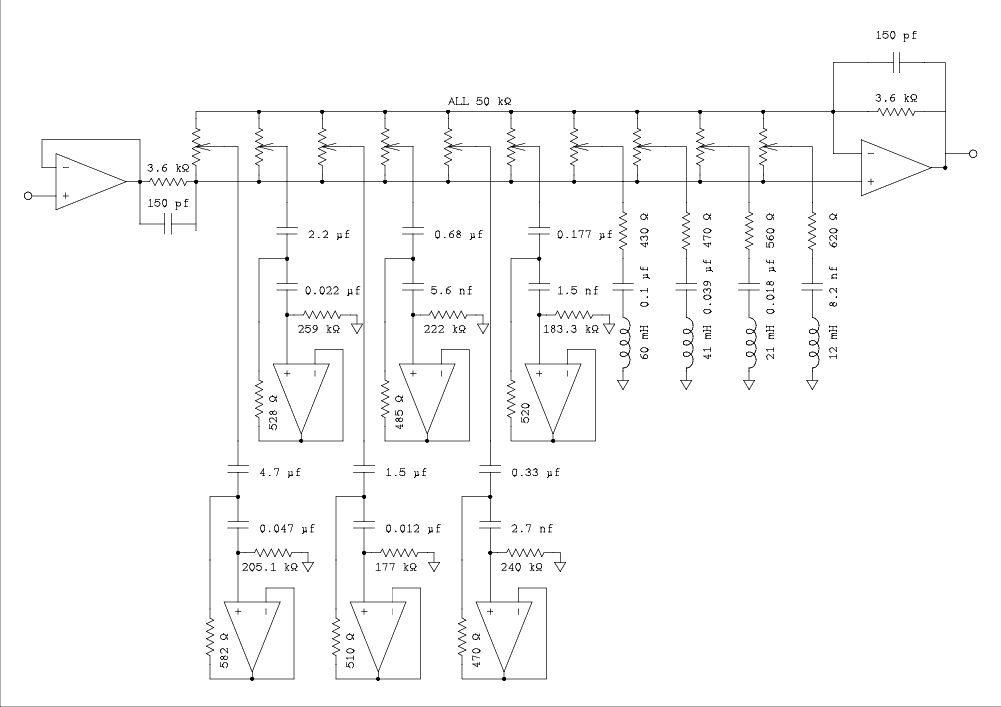 Below you will find the equivalent circuit of equalizer with all pots combined in parallel.