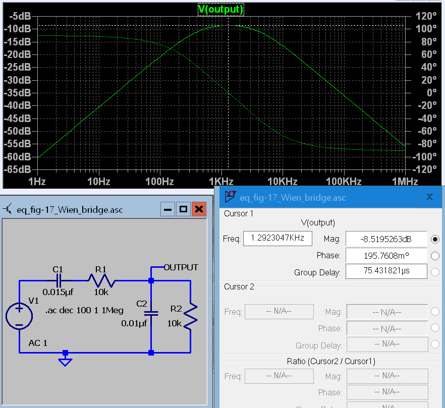 Figure 16 Frequency Plot and Schematic of Basic Wien Bridge.