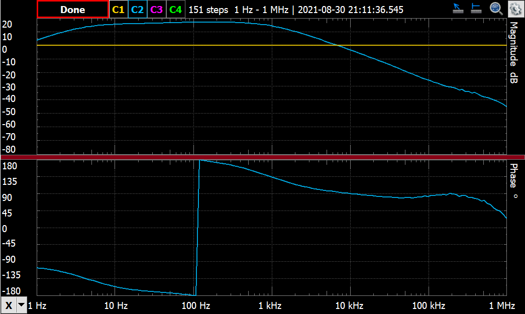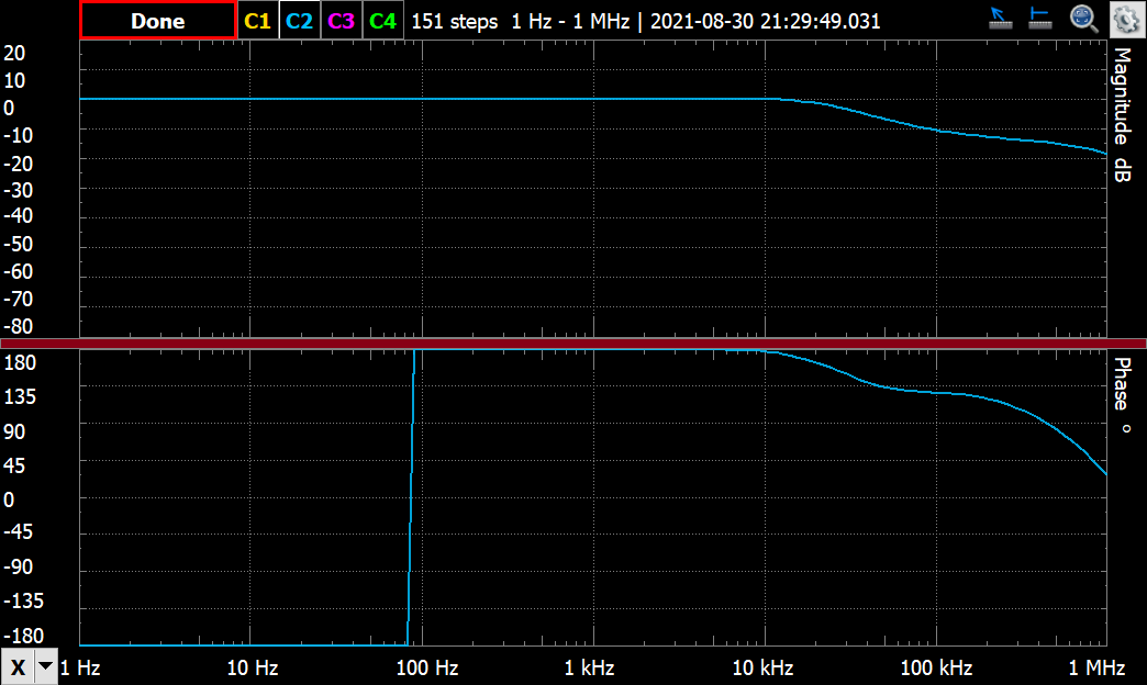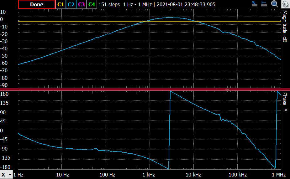 but when I built it and closed up the feedback loop it was a 100 kHz oscillator. I spent the next two months running frequency responses on the Analog Discovery and trying to get a decent Bode response on both the high and low ends