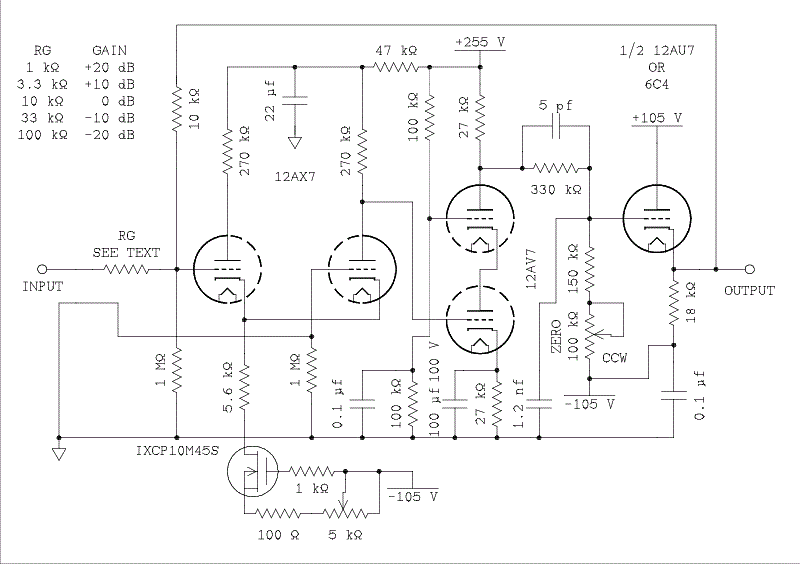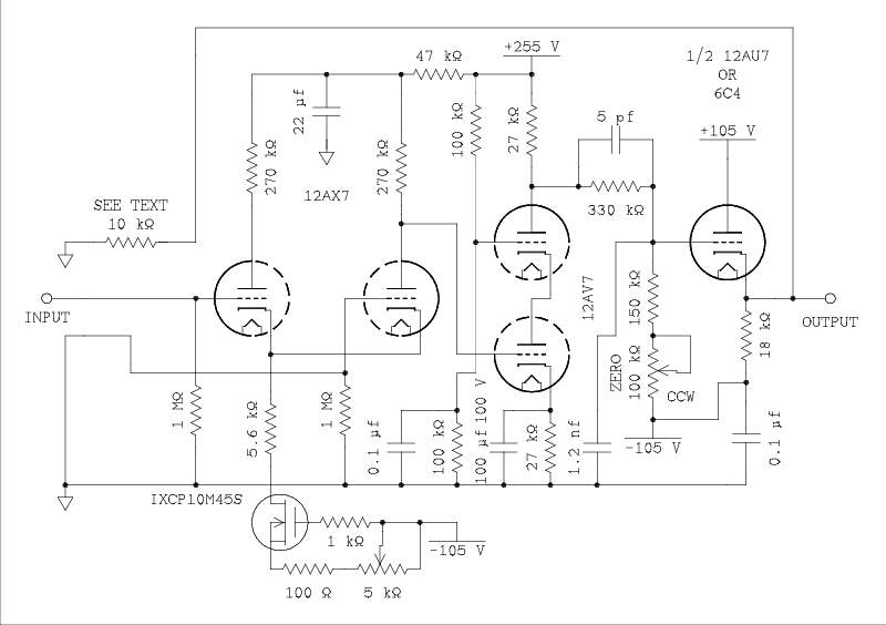 Number 5 is easy, a cathode follower. Because the top plate of a cascode amplifier is at a higher voltage than the heater to cathode breakdown of most tubes, an RC coupler would have to be inserted here. For the follower I decided to round up the usual suspect and use a 12AU7. If only one channel is to be constructed The other triode can be used as a cathode follower at the input of the circuit. If you are planning to build two channels I suggest that the two triodes in one of the 12AU7s be used as the input cathode follower and the two in the other 12AU7 be used as the output stage of the amplifiers.