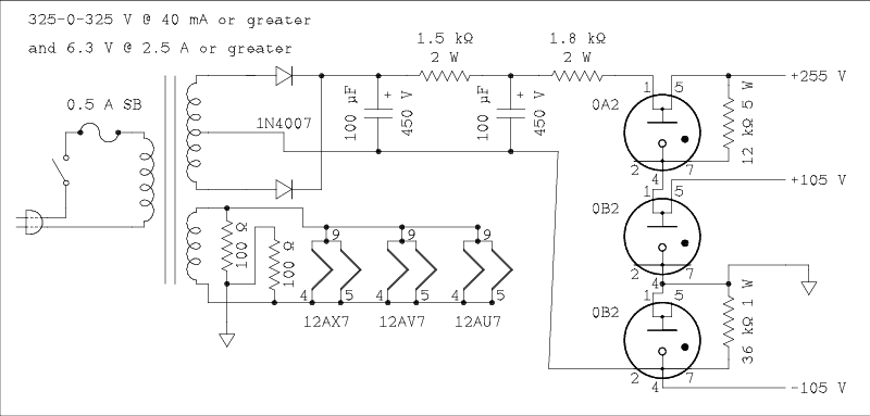 The specifications for the transformer shouldn't be hard to match among the Hammond listings on Antique Electronics Supply. The values of the two resistors in parallel with the VR tubes are given for one amplifier. If you are planning to build for stereo the values of the two resistors in parallel with the two VR tubes should be cut in half and the wattage rating increased appropriately. I recommend building the power supply on a separate chassis from the equalizer circuit.
