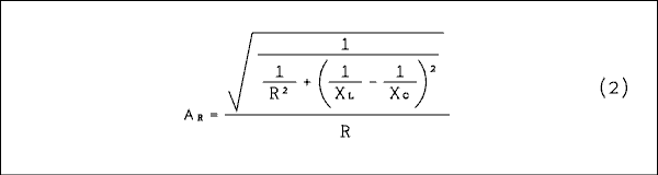 The attenuation ratio, gain at any frequency divided by the gain at the resonant frequency, AR is numerically equal to the impedance ratio. Therefore we divide the impedance at any frequency by the impedance at resonance.