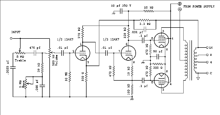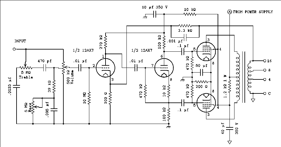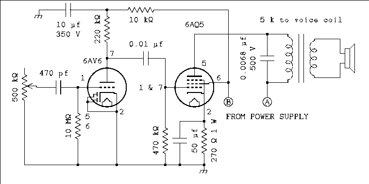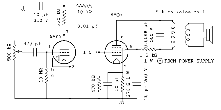 You can use either 6V6s or 6L6s in this circuit. The power transformer specified will support either one. The output transformer needs to be a 10 k ohm plate to plate primary for 6V6s or 5000 ohms for 6L6s. The 200 ohm cathode resistor shown is for 6V6s and should be changed to a 120 ohm 4 watt for 6L6s. As with the simple audio circuit the screen supply comes from the power supply while the first audio and phase splitter plate supplies are derived from the screen supply. The tone controls are optional. If you don't want them eliminate everything to the left of the volume control.