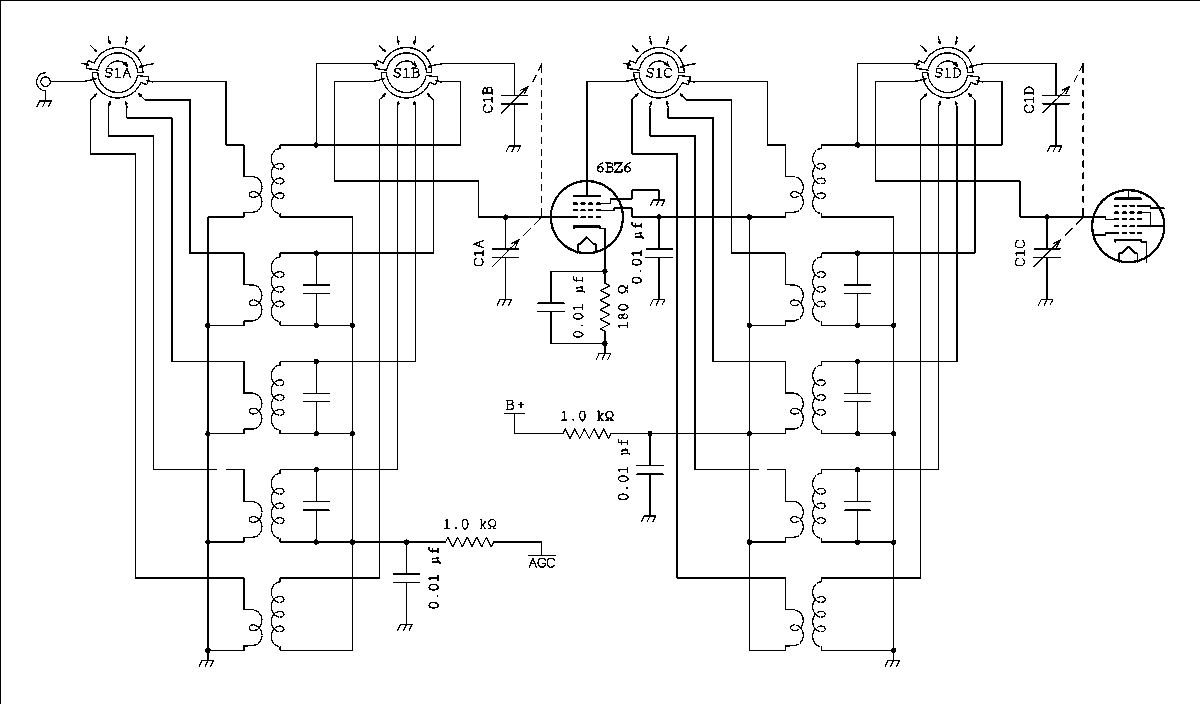 The diagram is essentially the same for all receiver types. The interpretation is a little different. As noted above the diagram is the RF stage from a Hammarlund HQ170. This is a fixed IF, ham band only, multi conversion receiver. Although the HQ170 covers from 160 through 6 meters only 5 coils are shown, 80 through 10 meters. This decision was based on availability of switch diagrams in my schematic drawing program.