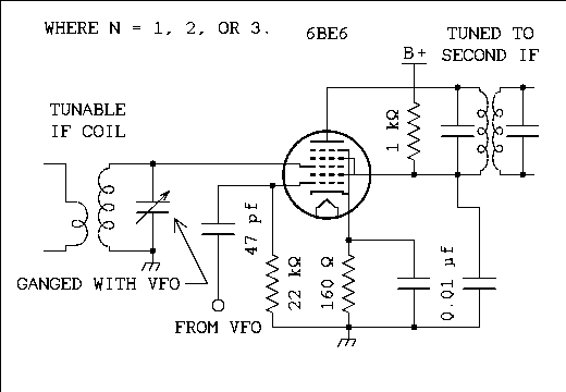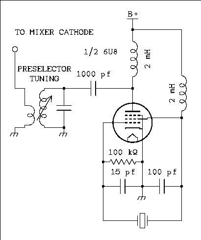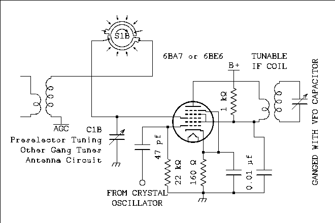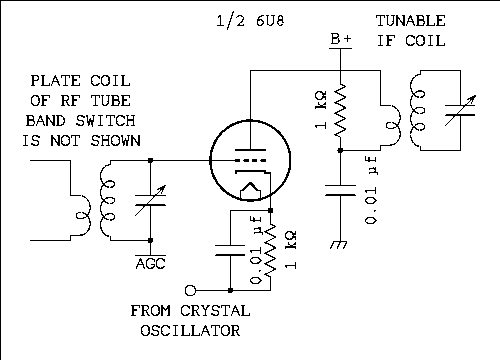 There is no law that says you have to build a mixer using a pentagrid converter. An ordinary pentode or a triode can be used.The drake 2B uses the pentode section of a 6U8 as the first mixer. Both signals are applied to the control grid of the tube. The plate coil in the 6BZ6 RF amplifier has been turned around and signal from the crystal oscillator which is the other half of the 6U8 is applied to the bottom of the secondary as shown in figure 7 below.