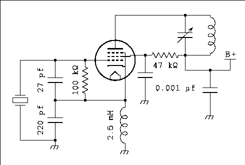 Figure 10 shows how Collins did it. This is a very standard circuit that I was taught to call a Colpits crystal oscillator although the handbook credits it to Pierce. The only slightly unusual thing about it is that feedback is taken from the screen grid. If the tube were a triode the plate would substitute for the screen.