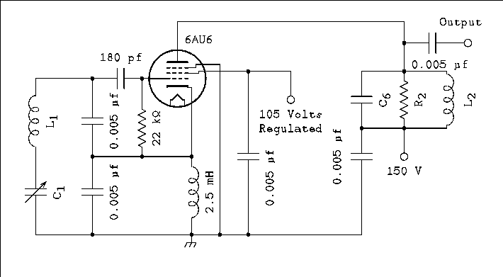 Figure 6 is of a converter. Note the similarities between this and Figure 3 which is a mixer circuit with an outboard oscillator not shown in the schematic. AGC is allowed in Figure 6 because the frequency of the oscillator is so low that any changes in frequency caused by the AGC voltage on the grid are so small as to be lost in the larger drift of the VFO. Let's say that a good VFO will drift about 100 Hz per hour. If the conversion oscillator in figure 6 is pulled by 10 Hz by AGC action the change will never be noticed.