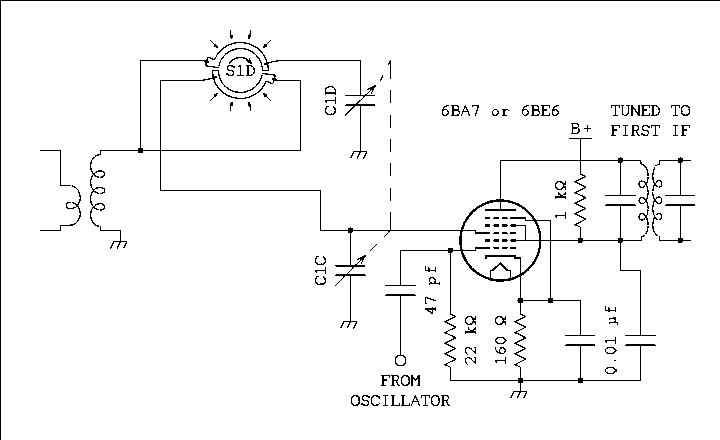 The difference is in where the oscillator is located. In a mixer the oscillator is in another tube or sometimes another section of the same tube such as in a 6U8.A converter takes advantage of the ability of a heptode tube to work as its own oscillator. In the overwhelming majority of circuits the oscillator coil has a tap which is connected to the cathode and the top end is connected through an RC circuit to grid 1. The circuit diagram will be seen later on this page.