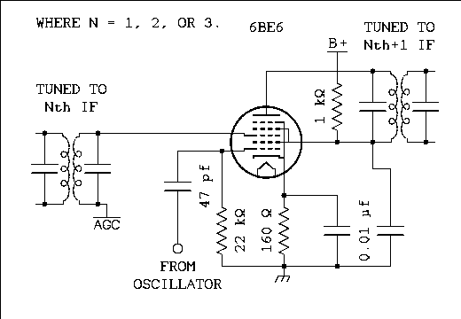 They use either a triode or a pentode and apply the local oscillator signal to the cathode. This applies from the first mixer through the product detector. Do I really need to say that the oscillator signal is coupled through a transformer which provides a path for the DC cathode current to ground? Well, I said it anyway. They also don't seem to hesitate to apply AGC voltage to the grids of these tubes even though the pentodes are sharp cutoff and it is presumed that the triodes are also. (Note: There are some tubes that are listed as semi remote cutoff triodes but these are dual triodes intended for use in cascode RF amplifiers in TV tuners. These might be a source of experimentation.)