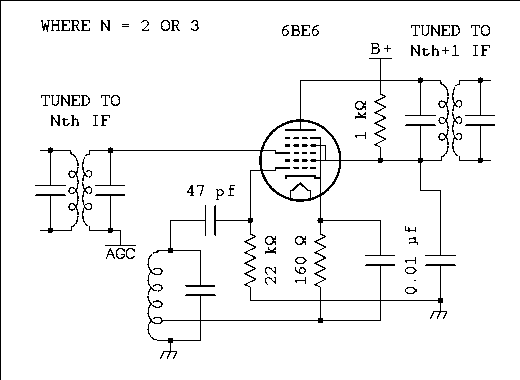 AGC is now permitted because the oscillator which does the conversion is crystal controlled. A 6BE6 is used here because the improved performance of the more expensive 6BA7 is no longer needed.