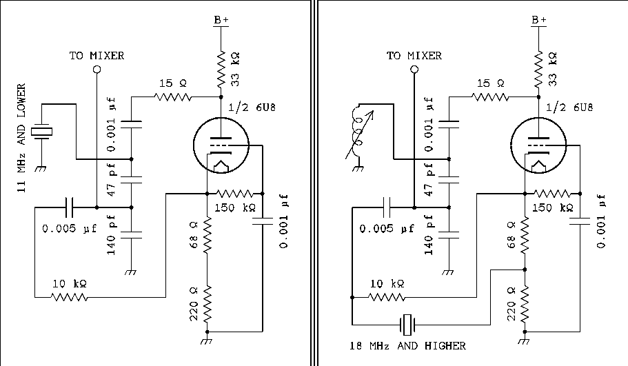 The quartz crystal has long been the standard of high stability for receiving and transmitting in the HF bands. [Today there are GPS disciplined ultra-high stability quartz crystal oscillators and some hams even own atomic clocks. They are not all that expensive when compared to the cost of a modern day synthesized transceiver but all that would seem out of place in a vacuum tube project.] Here are a few examples of crystal oscillators used by Drake, Collins, and the ARRL Handbook.