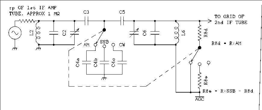 Strictly speaking a double tuned transformer is a band pass coupler. It has a limited bandwidth and couples signal from the plate of one tube to the grid of the next. However I have chosen to give that name to a more complex circuit that is not magnetically coupled and can be so arranged to permit a front panel switch to select different bandwidths. Figure 12 below.