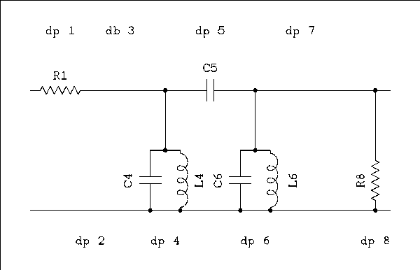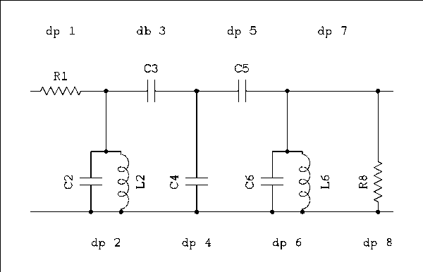 A word about what constitutes a dipole and takes up space in this diagram. Dipole 1 is the input resistor. In a real IF amplifier stage this will be the plate resistance of the IF tube. Dipoles 3 and 7 are short circuits, (pieces of wire). Dipole 2 is an open circuit. Don't ask me why the diagram is drawn in this way. I didn't write the program.