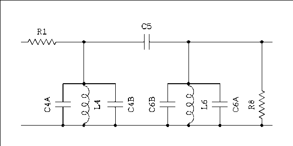 You are probably wondering what happened to L1 and L3 through L5. This is filter design convention. In a filter that begins with a T section the horizontal elements, dipoles as the programmer calls them, have odd numbers and vertical dipoles have even numbers. R1 is the plate resistance of the tube and if you use the filter design program described below it will be drawn horizontally and be dipole number 1. The parallel tuned circuit consisting of L2 and C2 make up dipole 2. Dipole 3 is C3 and so on up to L6 and C6. Dipole 7 is really there but it is just a piece of wire symbolized by a straight line. Dipole 8 is the load resistor. Filters of this kind require a load resistor in order to work properly. Note that C2 and C6 have been split into two capacitors a fixed one and a variable trimmer to allow the resonant frequency to be adjusted to the exact center of the IF.