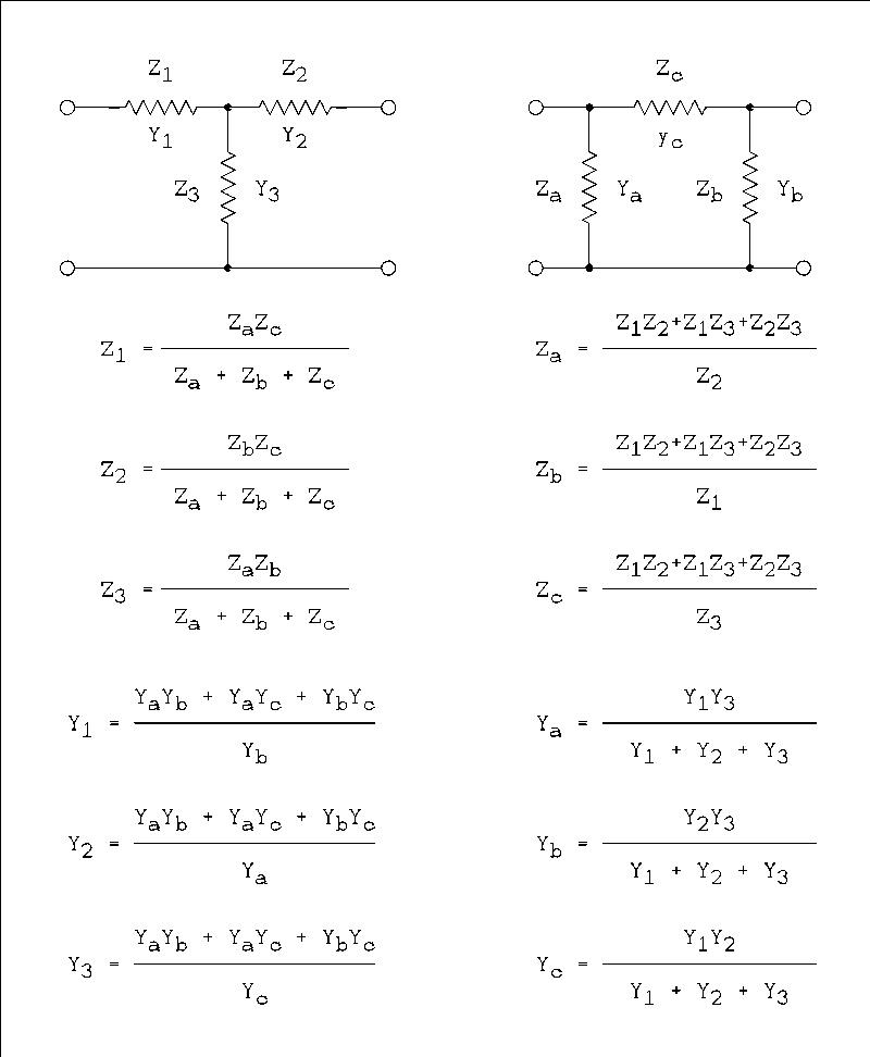 Here is the whole thing in case you ever need it. But we only need to go one way from pi to T. Since the reactance is proportional to 1/C and reactance is part of impedance we don't want to use the Z equations. Z = 1/Y so we use the Y equations and since everything is proportional we simply substitute C for Y in the equations.
