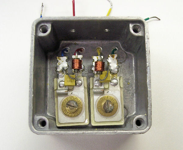 I once had a page elsewhere on this site giving detailed instructions for making a set of 455 kHz IF transformers for use in home brewed AM radios. But like a manufacture I had supplier problems. One went out of business and the other discontinued the parts I had specified. I'm going to reconstruct the page with the caveat that you are on your own when finding the parts. I can and will give you a link to the aluminum box. If the link doesn't work the item is available from Antique Electronic Supply and is part number P-H1590LB.Figures 7, 8, and 9, show construction of the transformer. These also show the three different coils I went through. The first and best was a Hammond 1 mH RF choke from AES. They discontinued it and I think Hammond has stopped making all of its RF choke and radio coil line. I can't find them on their website. I can't remember where I found the second one which was a 1.2 mH choke. It had a lower Q than the Hammond. But like the first it disappeared from the market. The third had even lower Q and came from Ocean State Electronics. I did my best to keep them in business but they went under anyway. Figure 9 shows the OSE choke. I'm not sure which of the remaining pictures is of the Hammond chokes