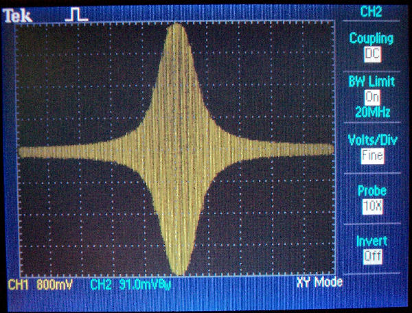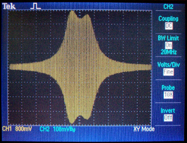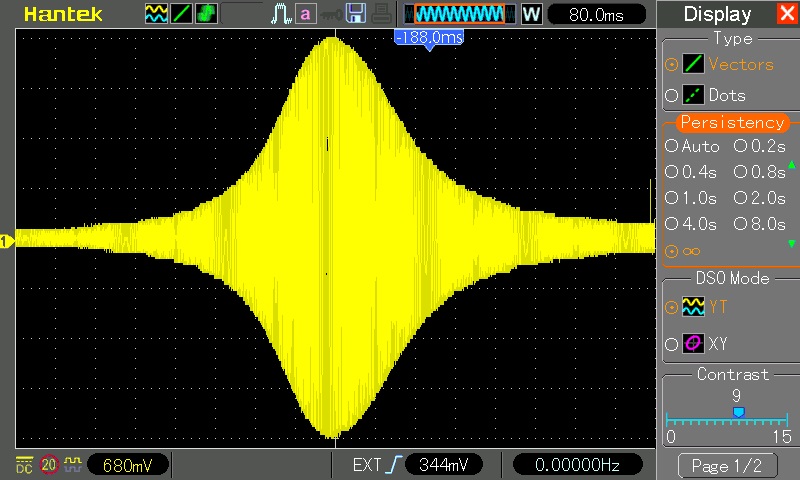 Here is the frequency plot I obtained. I set up my digital function generator for a 16 kHz sweep centered on 80 kHz. The scope is a new acquisition. The first time I tried to read a time interval it threw me for a loop. Instead of the usual 10 horizontal divisions which were decreed by Tektronix more than 60 years ago it has 16 divisions. The horizontal scale is 1 kHz per division. With the sweep rate at 80 ms per div the sweep time is 1.28 seconds. I set this as the sweep time on the function generator. Then I set up my old analog function generator to trigger both the scope and the sweep of the digital function generator. I adjusted the amplitude so the pattern exactly filled 8 divisions vertically.