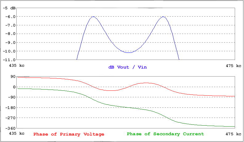 In figure 5 two over coupled resonant circuits are simulated. In addition to the amplitude response the phase of primary voltage and secondary current are plotted. Note that at the resonant frequency the phase relationship is 180 degrees and moves off of that value away from resonance.