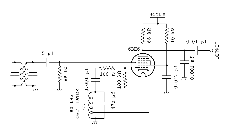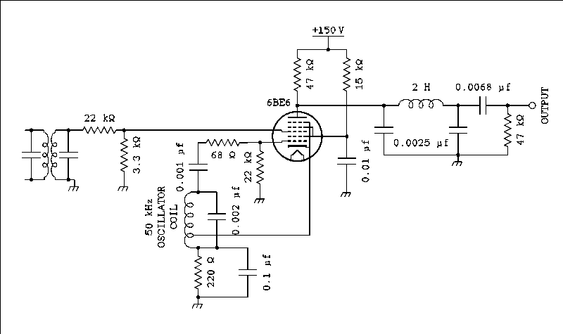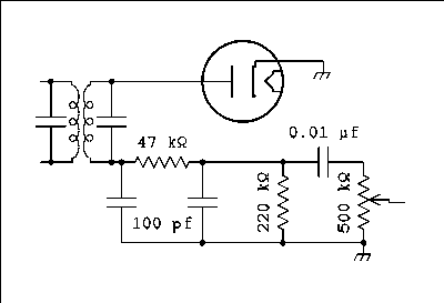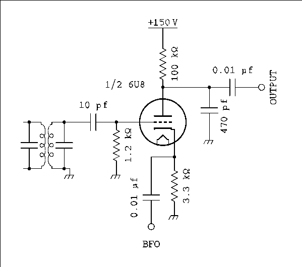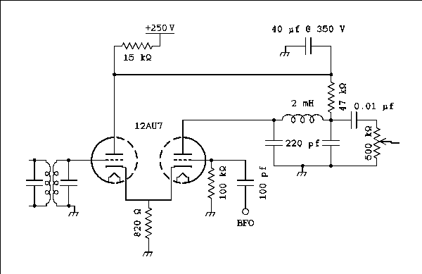 To improve the filtering Change the bypass cap to 330 pf and add an L section consisting of a series 68 k ohm and another 330 pf cap to ground. This will give an attenuation of 34 dB at 50 kHz and 3 dB at 2700 Hz. The Hallicrafters SX 101 used a strange tube, a 6BY6 which is called out on the schematic as a 6BY8. A 6BY8 is a 9 pin pentode/diode and has no relationship to the tube diagram shown. They must mean 6BY6 which is a sync separator and keyed AGC tube for TV sets. However, the internal diagram of the tube is exactly like a pentagrid converter. It appears that the IF signal is applied to grid 1 while the oscillator (BFO) is applied to grid 3. I say it appears because there seems to be a mistake in the diagram to go along with the tube number. I could not trace pin 3 back to the BFO but I could trace pin 1 back to the last IF amplifier.