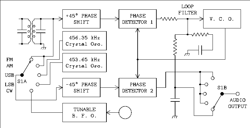 For FM detection the audio is taken from phase detector 1 and for AM from phase detector 2. When a locally generated signal is substituted for the IF signal in phase detector 2 it becomes a product detector and will detect CW or SSB signals the same as any other product detector circuit.
