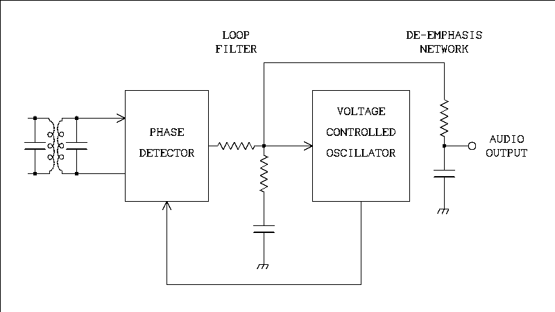 Although it is hard to see what is the VCO (voltage controlled oscillator) and what is the phase detector the 6BN6 detector is essentially a phase locked detector. The diagram above shows how it works. The phase detector locks in the VCO with a 90 degree phase difference from the incoming carrier. The phase detector yields zero volts out when the phase difference between the two signals, the IF signal and the VCO output, is 90 degrees. When the incoming signal increases in frequency the VCO remains locked at the same frequency but the phase changes to permit the phase detector to output a different voltage to control the VCO.