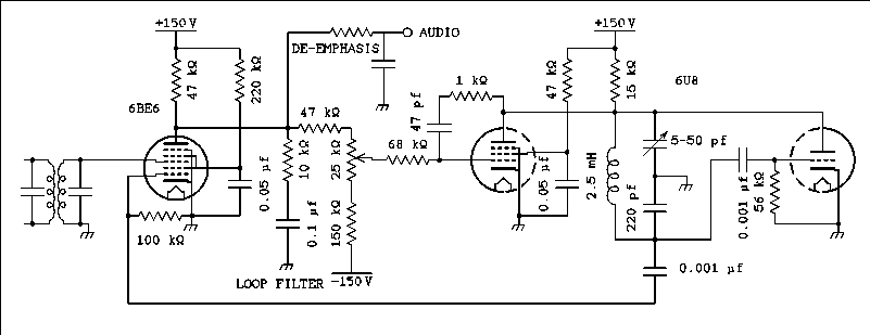 OK, now that we've cleared that issue up, the two signals are fed to the 6BE6 which performs the phase comparison and controls the VCO consisting of both sections of a 6U8. The pentode section is a circuit known as a reactance tube which performs the same function as a variable capacitance diode. The triode section should be recognizable as a Colpits oscillator. The demodulated audio is taken off at the plate of the phase detector tube (6BE6). Once component values have been set in stone the loop filter and de-emphasis functions could probably be performed by the same two components.