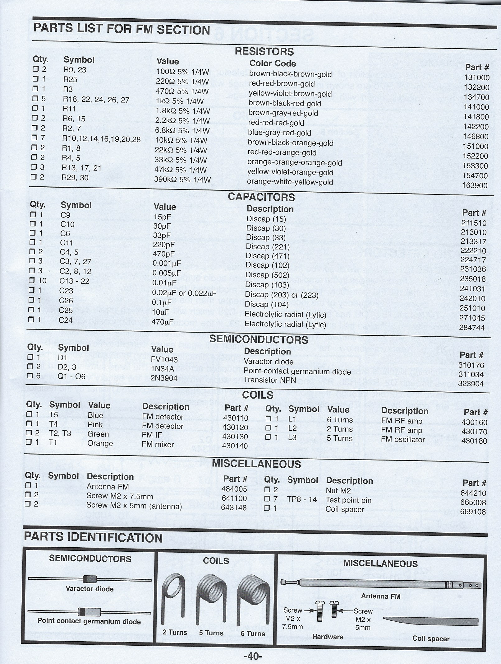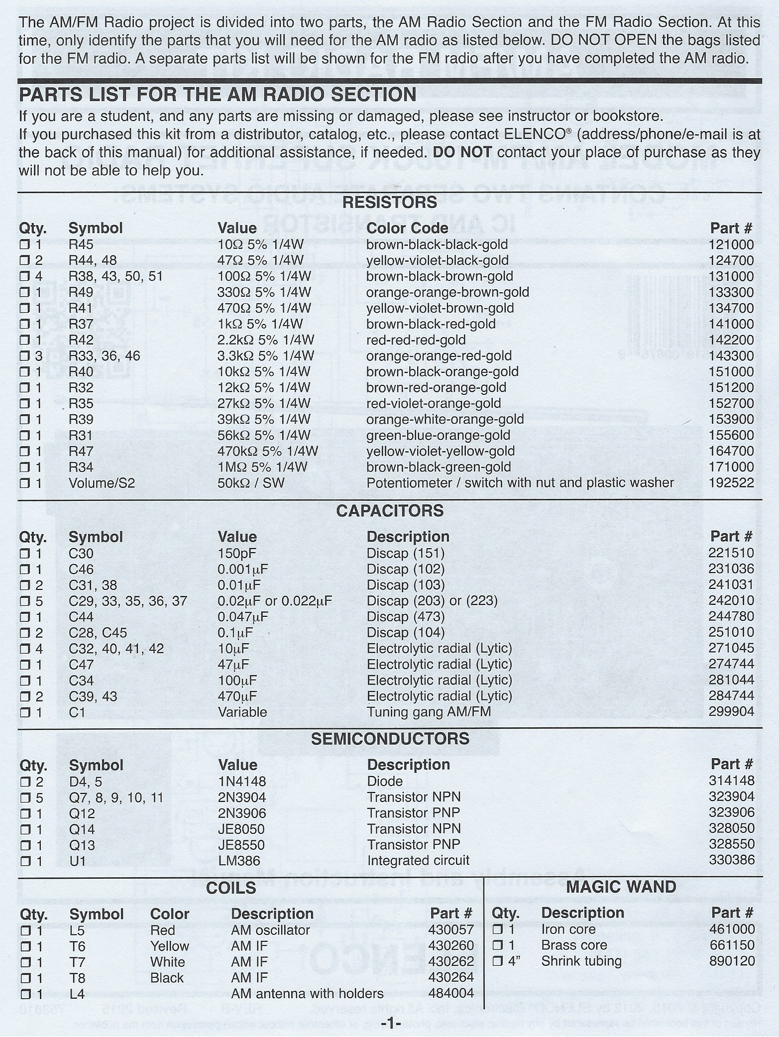 For a verbal description click here. Figure 2 Parts list for ELENCO AM / FM Radio Kit. For a verbal description click here.