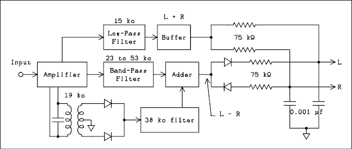 That is the reason for the 19 kc pilot signal. It serves one practical purpose of telling the receiver that a stereo signal is being received but its main purpose is to help the receiver regenerate the 38 kc carrier. In the simplest form of stereo demodulator the 19 kc pilot is run through a full wave rectifier and then a filter to remove the harmonics. The difference signal is passed through a filter to remove the audio and pilot signals, combined with the 38 kc carrier and detected with a pair of diodes. One diode is reversed from the other which gives the opposite phase signals for addition and subtraction. These recovered signals are combined with the audio sum signal through a resistor network and there are the L and R signals. Capacitors are added to the resistor network to apply de emphasis. It was not applied to the sum signal before this point. Preemphasis is added at the transmitter to the two L and R signals before they enter the stereo multiplex modulator.