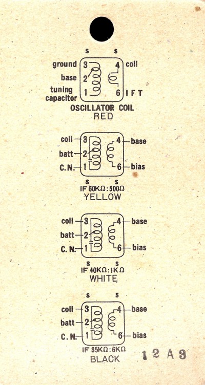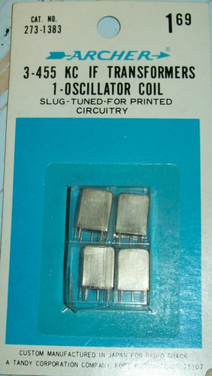 My first experience with these transformers was when Radio Shack offered a blister pack of the 3 IF transformers plus the oscillator coil. Below you will see both sides of the card they were packed on.