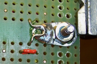 Lay the lug over the board mounting hole between holes E15 and F15. It must not short the leads of the capacitor that will later be installed in holes E12 and F12. If it is even close use your diagonal cutters to perform surgery on it as shown in the first picture below until it will fit into the space as shown in the third and fourth pictures. Diagonal cutters leave behind a knife like edge that can do some serious damage to your epidermis. You shouldn't have to ask me how I know. Use a small file to blunt the knife edges and smooth out the profile.