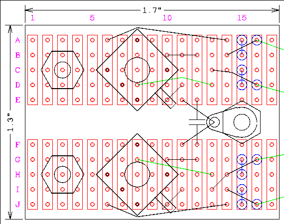 Lines in green indicate wires that are on the foil side of the board. Holes with blue circles around them are to be enlarged by drilling with a 1/16 inch bit. This should have already been done. Wires that turn from black to green as they pass through an enlarged hole mean that the wire is passing from the component side to the foil side.Perform each of the following steps twice, once for each board.