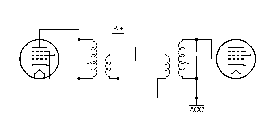Vacuum tube AM radios use double tuned transformers for good rejection of stations on adjacent channels and wide bandwidth which gives good high frequency performance on the desired station. That means that there is a total of 4 tuned circuits in the IF amplifier. Transistor IF cans have only one tuned circuit which has a tap to match the low impedance of the collector and an un tuned low impedance secondary to match the even lower impedance of the base of the next transistor in the IF amplifier. My plan is to use two transistor IF transformers to make a single tube type one.Instead of trying to magnetically couple the resonators in two transistor IF cans I am going to design band pass couplers. The circuit I have arrived at does not require any modification of the transformer and the transformer itself does not experience any B+ voltage between primary and secondary.