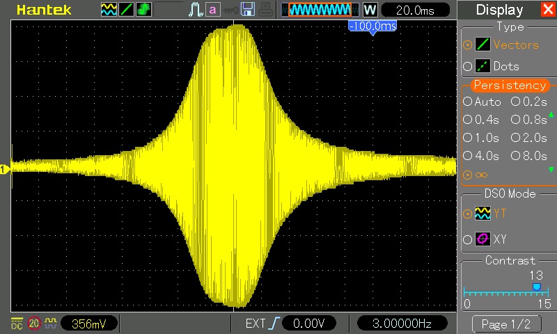 Above is a sweep of the filter. The horizontal scale is 4 kHz per division and vertical sensitivity was adjusted to give a full vertical deflection of 8 divisions. 3 dB down is 5.6 divisions. Which for a symmetrical pattern is 2.8 divisions from center. I get a -3 dB bandwidth of 10.6 kHz which is about right for an AM radio. That's not high fi but nobody plays music on AM now anyway. Note: I am assuming that two of these circuits will be used in a typical radio so the total attenuation will be 6 dB at a bandwidth of 10.6 kHz. End of note.