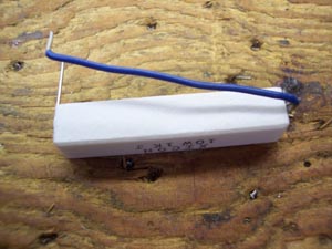 - Bend the bottom lead (3/4 inch long) away from you until it is at right angles to the resistor body as shown in the photo.