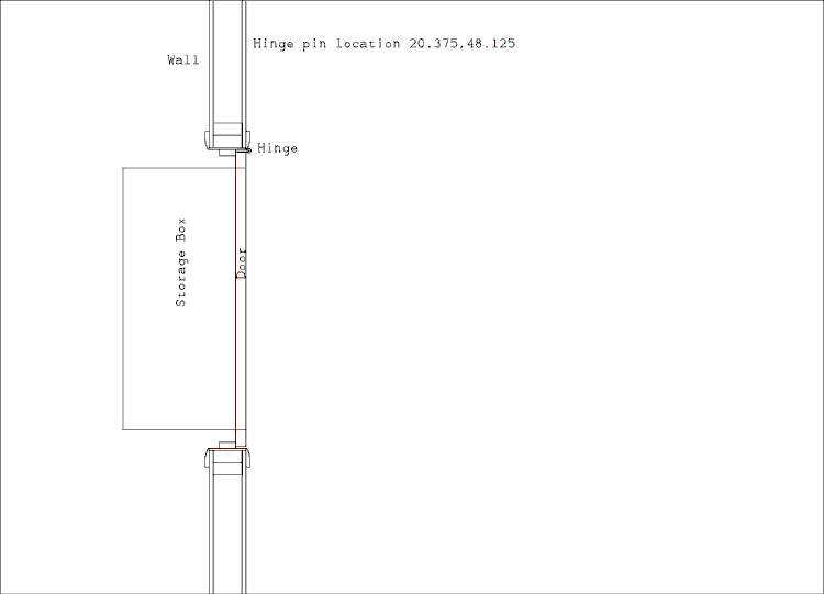 This project is actually being seriously planned as an addition to my electronics shop which is in a spare bedroom of the house. The interior of the box will be accessed from the front through a door within a door. Details have been omitted to avoid a cluttered drawing. The point is to make sure the assembly can be opened without the box striking the door jam.Notice that the corner of the box passes through the frame. The vertical component of the distance from the corner of the box to the hinge pin is greatest when the corner is directly below the hinge pin. Play with the stop angle until the corner stops at this point. Decimal fractions of degrees are allowed.