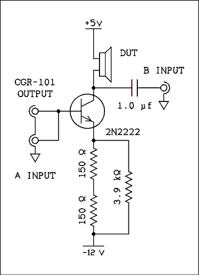 The signal source has a low impedance and is DC coupled which eliminates the need for any biasing resistors in the base circuit. The CGR-101 inputs have no AC mode which requires an external blocking capacitor. I am sure there is at least one person shouting at their computer screen "THERE IS DC ON THE SPEAKER VOICE COIL!!!" True. But it is so small as to have no detectable effect on the results. If you own one of these instruments and you want to duplicate the results on your own speakers you may have to adjust the value of the 3.9 k ohm resistor. It's purpose is to trim the gain of the current source so it gives exactly -30 dB on the graph with an 8.00 ohm resistor connected as the DUT. The impedance is found by,