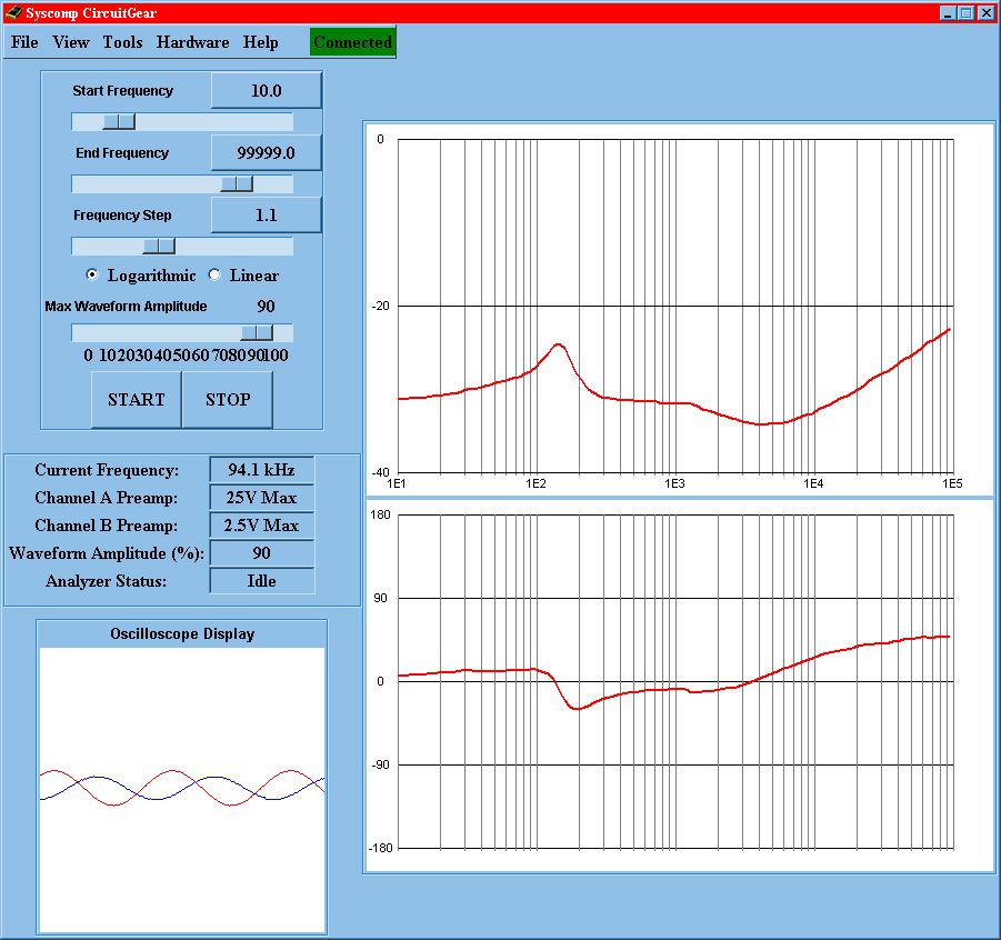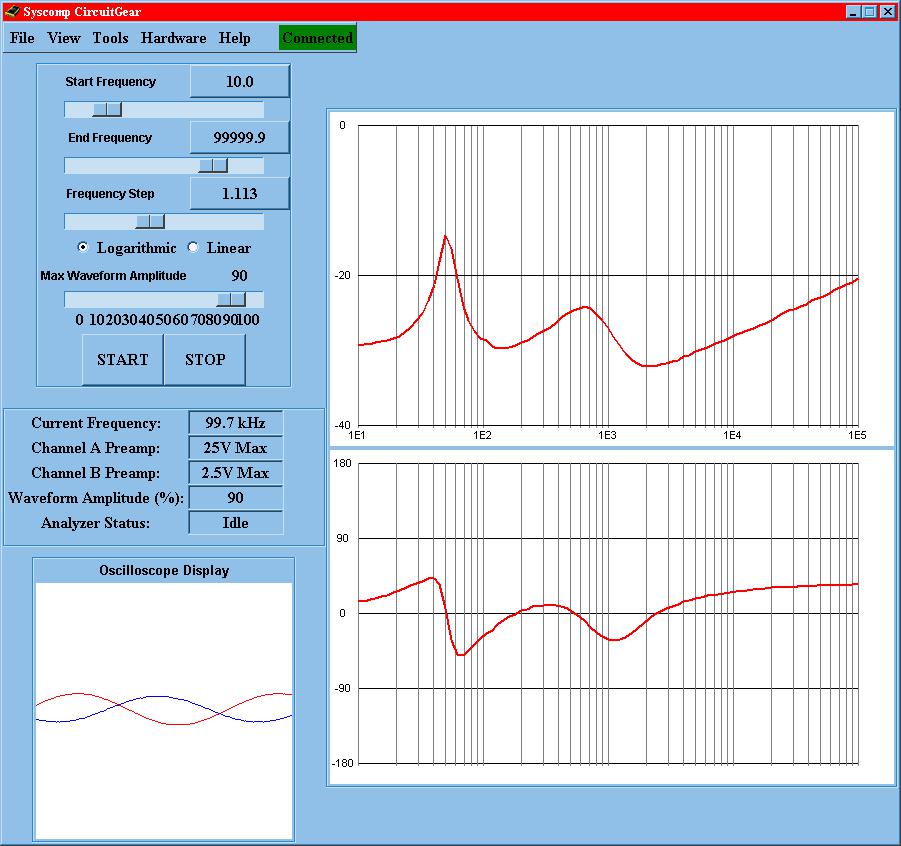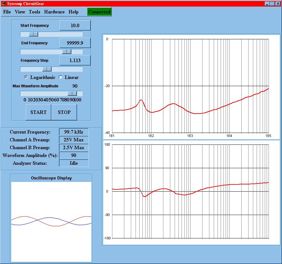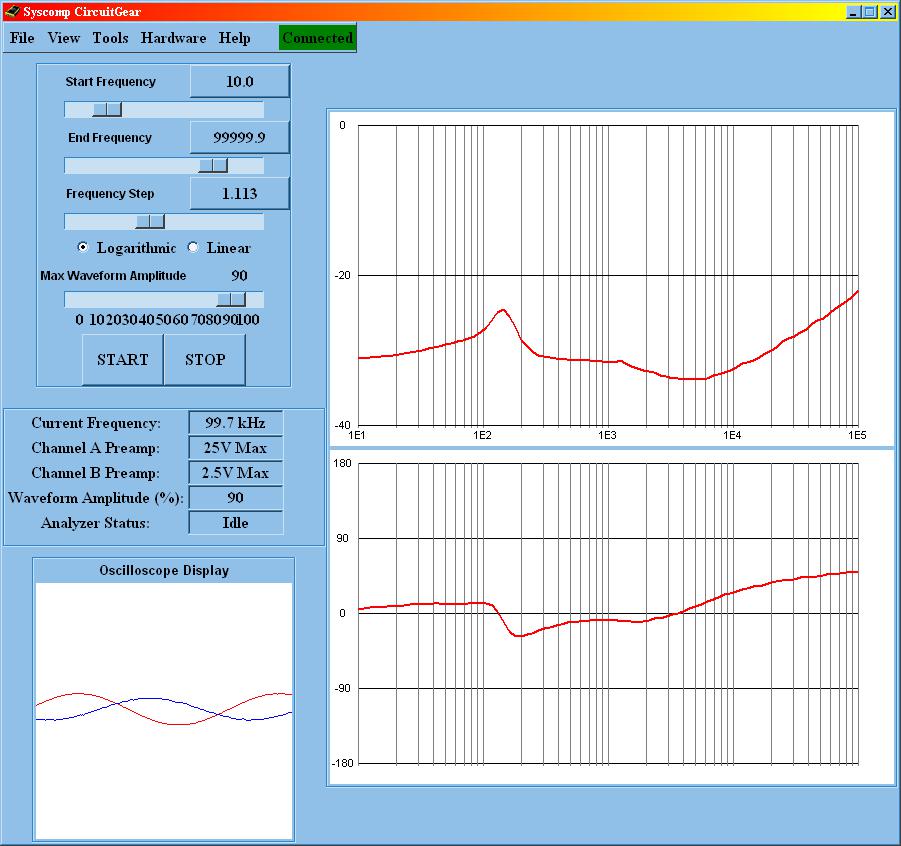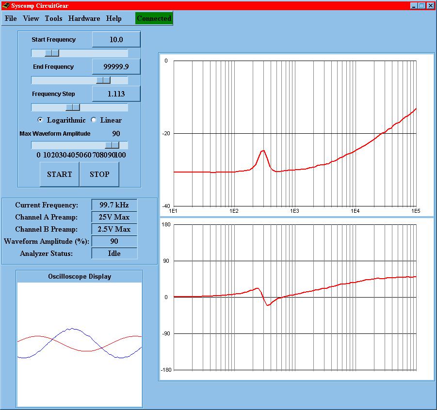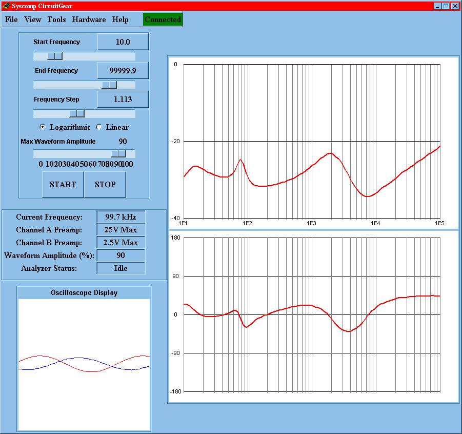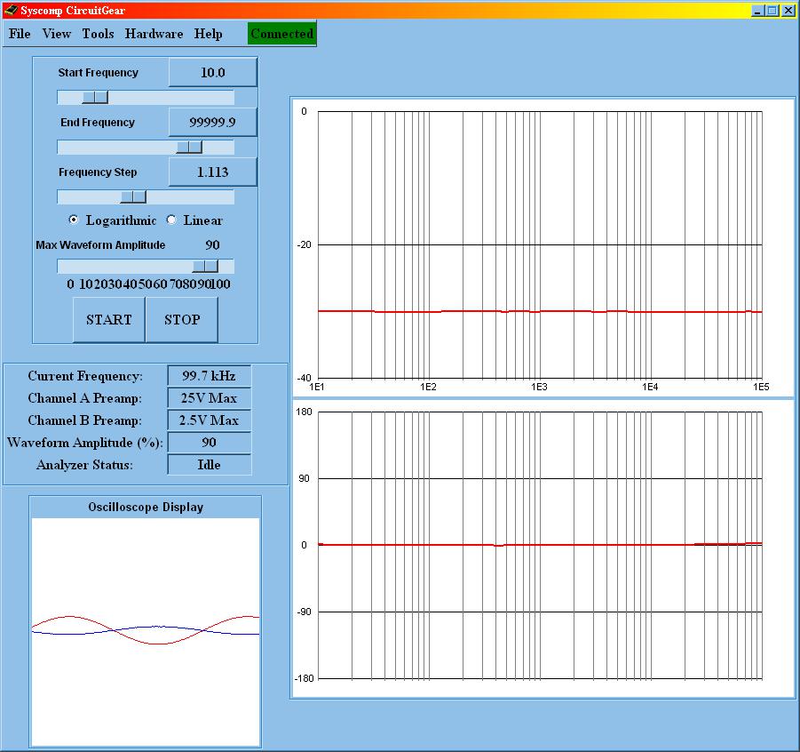 dB = 20 Log(V(Channel B) / V(Channel A)) So all I have to do is apply a voltage to channel A which is directly proportional to the current through the DUT (device under test). A transistor with a resistance in its emitter that is large compared to the resistance in the collector is an excellent current source.