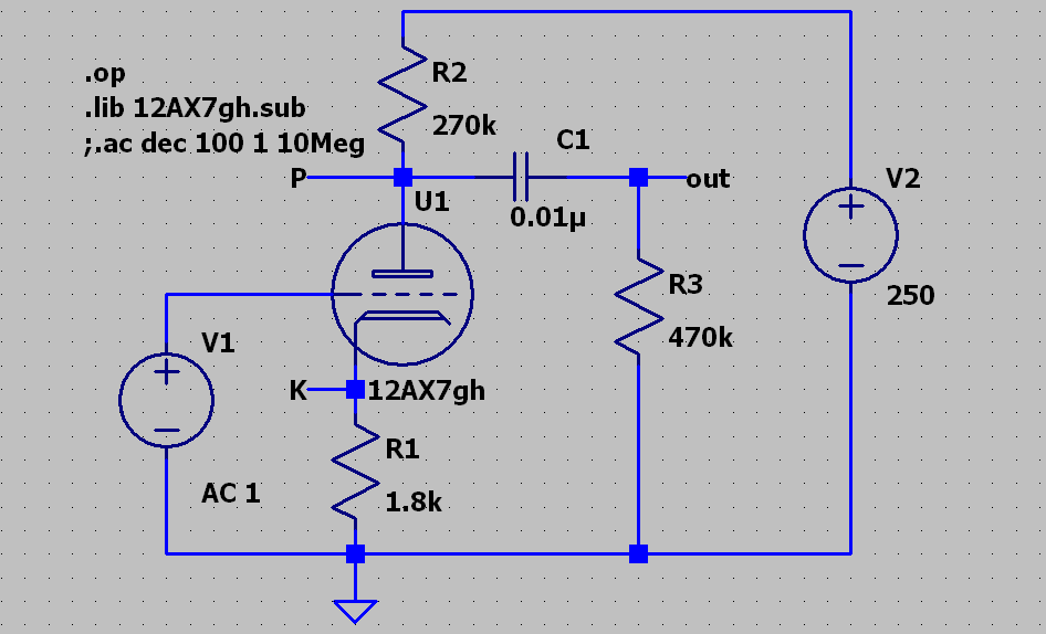 Placing the tube symbol on the schematic drawing board is not enough. LT Spice needs a model for the tube to go with it. One way is to place the entire text of the model on the schematic. Another way is to place the model text in the netlist. But the easiest way was shown to me by an experienced LT Spice user on our email list. Just include the single line of text ".lib modelname.sub" on the schematic. In this specific case you see ".lib 12AX7gh.sub". The label on the tube symbol must be exactly the same as that part of the line between "lib " and ".sub". The "gh informs us that this is a model that came from the file downloaded from Github. This will not work on your computer until you have downloaded this file and pulled out the 12AX7 model from the file and placed it in a file of its own with the .sub extension. LT Spice checks the file name and the subckt (sub circuit) name. If they are not the same it issues an error message. The name within the file, the file name, and the label on the tube symbol must all be exactly the same or it won't work.I'm not going to show you the results. You'll have to draw the schematic on your computer and run the simulation to see them. As shown you will get a text display of the voltages and currents in the circuit. To see the frequency response, right click on the line that begins ";.ac" and remove the semicolon ; You don't have to disable the .op command by putting a semicolon in front of it but maybe you should form the habit of disabling unused commands.