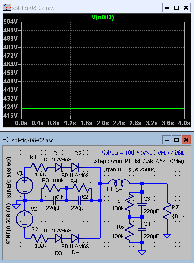 Simulating figure 8.1 in spice has its pitfalls as well. Although capacitors have no voltage limit in LTspice I have shown seriesed capacitors so I could also show the equalizing resistors. They constitute a minimum load current on the supply which can effect it's no load voltage. In spice, Silicon diodes are modeled with their reverse breakdown voltage. LTspice doesn't appear to come with any diodes with reverse voltages any higher than 600 volts so I had to series two diodes on each side to make the power supply work properly.